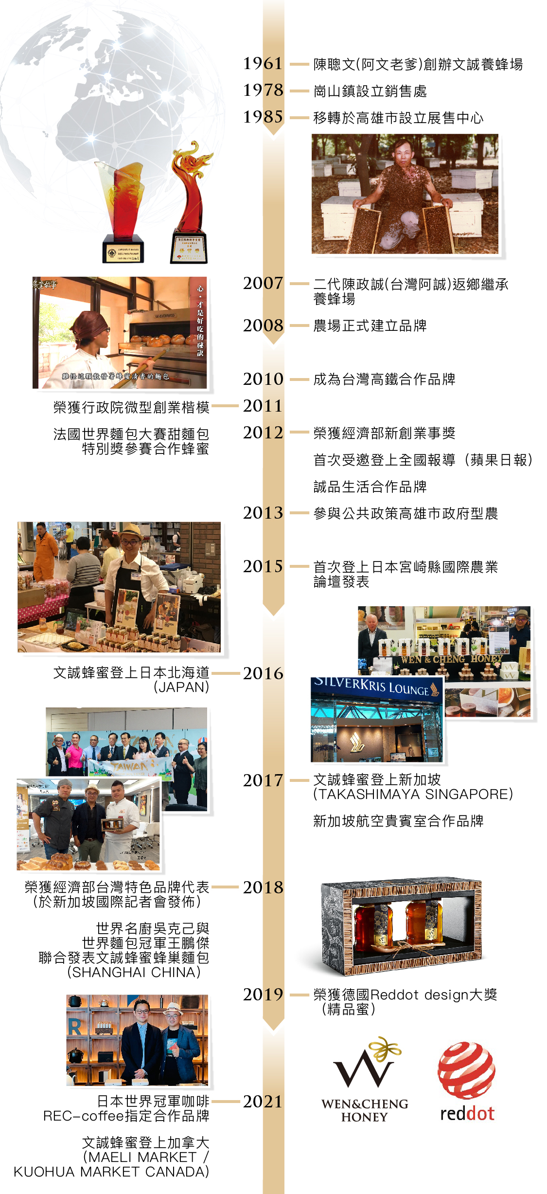 老爹常跟後輩說著:要尊重蜜蜂,蜜先留給蜂,足夠再取;要尊重養蜂旅途與人生旅途上遇見的人們,遇到農家打聲招呼,蜂群在哪座山、哪戶人家的果樹吸食過花蜜,釀成蜜後,就送一罐回禮;要尊重社會與老天,氣候越是多變的時候,越要一步步踏實地走,不取巧的純粹,才能甜醇。文誠蜂蜜的「文誠」二字,象徵對土地人文的重視、用真誠與人相待,同時也是老爹創辦養蜂場時候,取自阿文及二代阿誠的各一單字,『共生共榮、將心比心』是創辦人的蜜蜂農場堅持一甲子經營理念,用愛孩子的心來釀造純淨蜂蜜,用感恩的心珍惜支持的客人!
