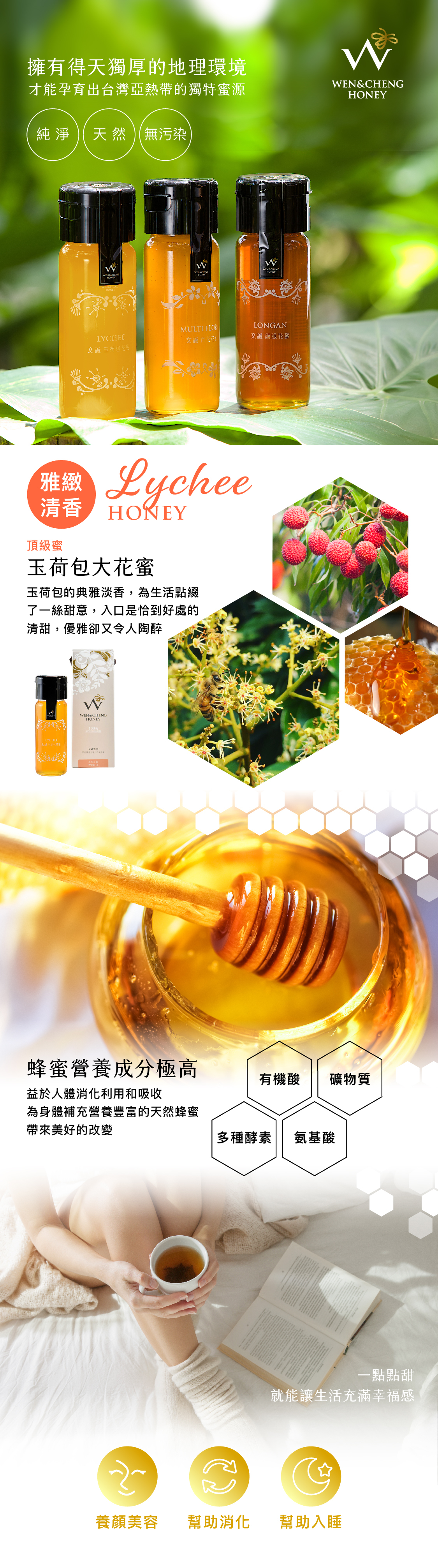 採集亞熱帶氣候與大樹紅土丘陵玉荷包果樹林間孕育蜜源,玉荷包花蜜的典雅淡香,為生活點綴了一絲甜意,入口是恰到好處清甜,優雅又令人陶醉。