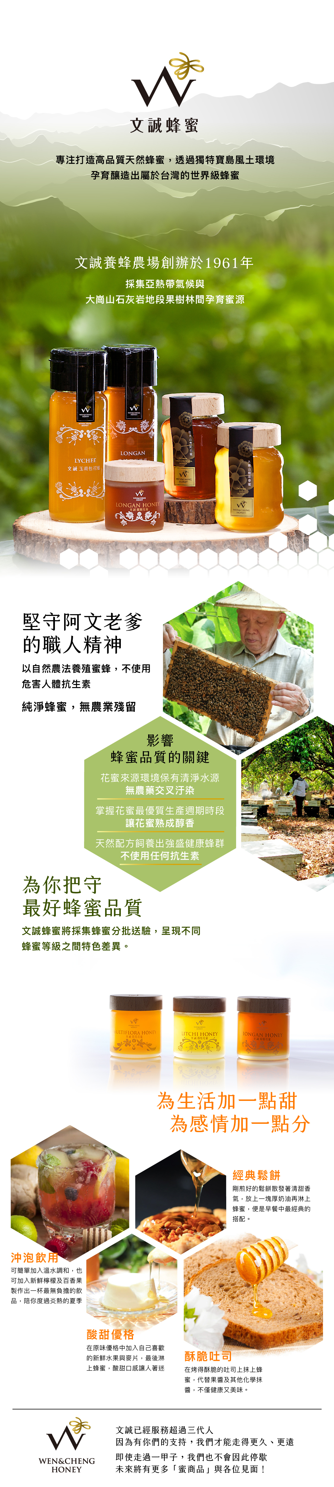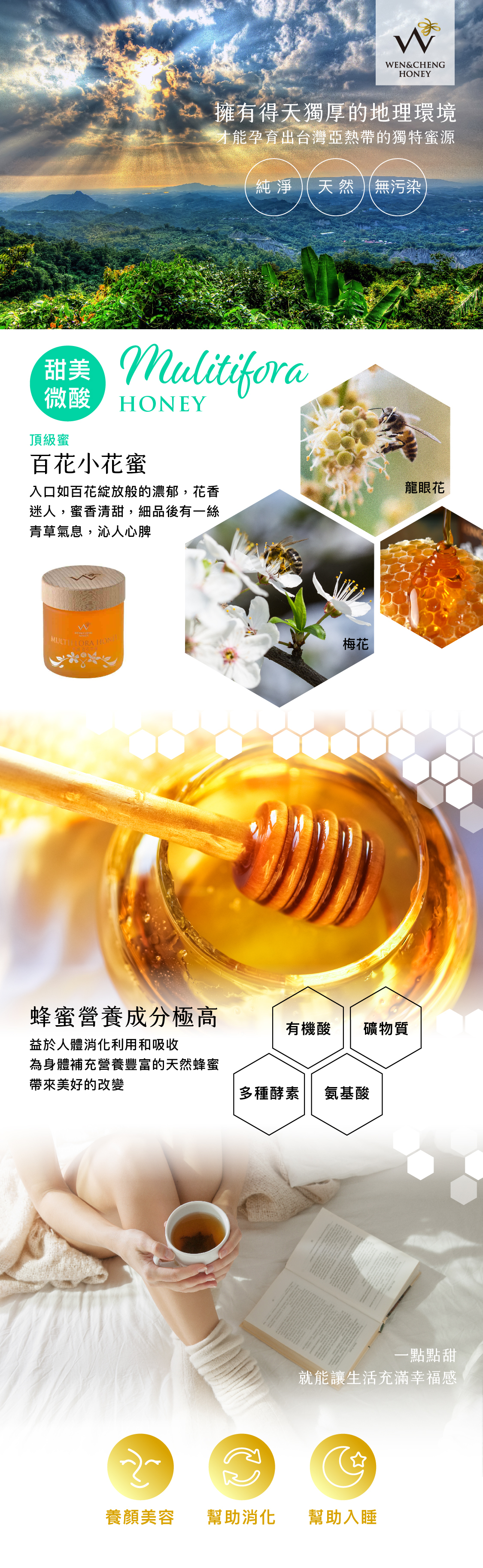 採集亞熱帶氣候與台灣東部山谷地區孕育蜜源,入口如百花綻放般濃郁,花香迷人,蜜香清甜,細品後有一絲青草氣息,沁人心脾。